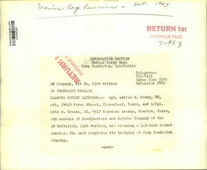 Cleaning rocket launcher - Sergeant (Sgt) Adrian E. Dowdy, 28, left, 14410 Force Street, Cloverleaf, Texas, and Lieutenant Corporal (L/Cpl.) David P. Greene, 20, 4517 Keystone Avenue, Houston, Texas, both members of Headquarters and Service Company of the ... Battalion, 23rd Marines, are cleaning a 3.5-inch rocket launcher. The unit completes its training at Camp Pendleton, California Saturday. Marine Corp Reserves. U.S. United States.