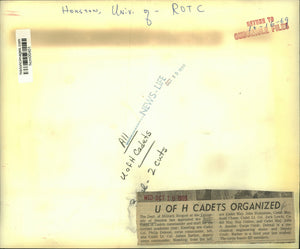 The Department of Military Science at the University of Houston has appointed the ROTC Corps of Cadets commander and staff for the current academic year. Kneeling are Cadet Colonel (Col.) Philip Dolezal, corps commander, left, and Cadet Lieutenant (Lt.) Col. James Barker, deputy corps commander. Standing, from the left, are Cadet Major (Maj.) John Blackistone, Cadet Maj. Scott Chase, Cadet Lt. Col. Jack Lewis, Cadet Maj. Roy Coston, and Cadet Maj. John A. Amsler. Corps Cmdr. Dolezal is a mechanical engineering senior and Deputy Cmdr. Barber is a third year law student. The corps boasts 227 members. Houston, Texas. UH ROTC