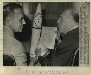 Washington, D.C. - Army Secretary Wilber Brucker and the Army's Chief of Staff, General Maxwell Taylor, read one of the letters recovered from the nose cone of a Jupiter rocket which safely re-entered the earth's atmosphere after being fired into space. The rocket mail was opened today at the Pentagon. Between them is a model of the Army's Jupiter - the missile which carried the mail. Gen.