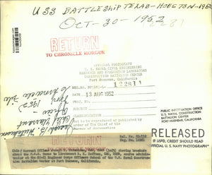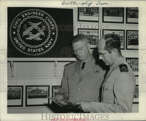 Chief Warrant Officer Joseph B. Hutchinson, CEC, USNR (left) showing brochure about the U.S.S. Texas to Lieutenant R. K. Hoffman, CEC, USNR, course administrator at the Civil Engineer Corps Officers School of the United States (U.S.) Naval Construction Battalion Center at Port Hueneme, California. USS Battleship Texas. - Houston, Texas. Military officers look at... United States Navy