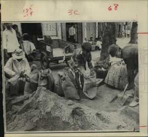 1968 Press Photo Enterprising Vietnamese fill sandbags for sale in Saigon