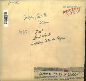Sandbag sales in Saigon. Enterprising Vietnamese fill sandbags on a Saigon sidewalk before loading them onto the cart in the background. This small industry has developed because of increased rocket attacks by the Viet Cong. Sandbags are used for bunkers. South Viet Nam. Vietnam.