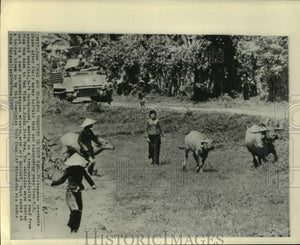 Vietnamese peasants chase after their water buffalo that are standing away from United States (U.S.) armored vehicles, left background, moving up a long-unpatrolled road from Bien Hoa east to Ben Vinh in south Viet Nam. The vehicles were taking part in a road reconnaissance mission, with air support, that ended at a bridge blown up by the Communist Viet Cong.