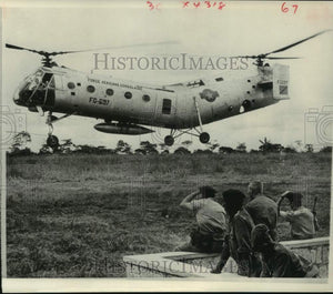 A United States (U.S.) supplied helicopter piloted by a Belgian crew and carrying supplies for Congolese government troops, prepares to set down at Kindu, The Congo.