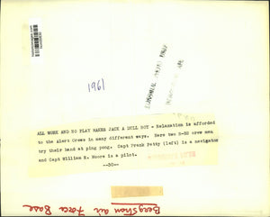 All work and no play makes Jack a dull boy - Relaxation is afforded to the Alert Crews in many different ways. Here two B-52 crew men try their hand at ping pong. Captain Frank Petty (left) is a navigator and Capt. William R. Moore is a pilot. Bergstrom Air Force Base (AFB), Texas.