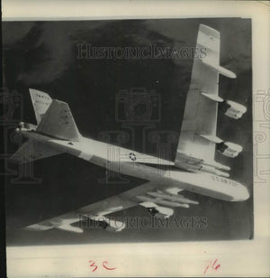 New bomber-missile team in test. Mockups of four Skybolt missiles that will give B-52H global jet bombers 1000-mile extension to their 11,000-mile nuclear punch show clearly under wings, near fuselage of B-52G in recent aerial check out. With regular nuclear bombs, new missiles will give one SAC bomber destructive power greater than bombs exploded by all Allied and Axis planes in World War II. Jets. Aerial test.
