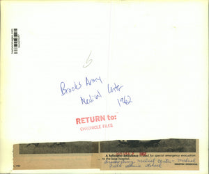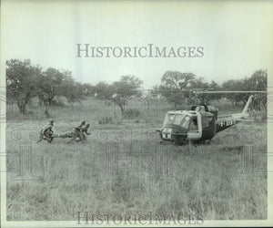 A helicopter ambulance is used for special emergency evacuation to the base hospital. Training at Brooks Army Medical Center - Medical Field Service School. Texas. Men run to...