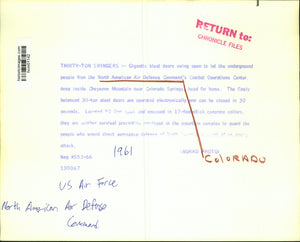 Thirty-ton swingers - Gigantic blast door swing open to let the underground people from the North American Air Defense Command's Combat Operations Center, deep inside Cheyenne Mountain near Colorado Springs, head for home. The finely balanced 30-ton steel doors are operated electronically and can be closed in 30 seconds. Located 50 feet apart and encased in 17-foot-thick concrete collars, they are another survival precaution employed in the mountain complex to guard the people who would direct aerospace defense of North American in event of an enemy attack. US Air Force.