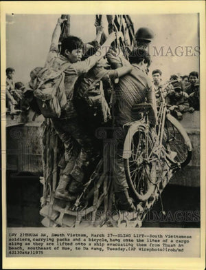 Thuan An, South Vietnam-South Vietnamese soldiers, carrying packs and a bicycle, hang onto the lines of a cargo sling as they are lifted on to a ship evacuating them from Thuan An beach, southeast of Hue, to Danang Tuesday.