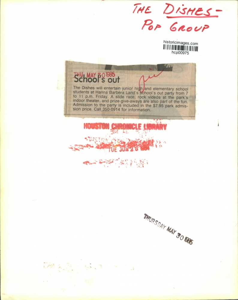 "The Dishes." Pop group. The Dishes will entertain junior high and elementary school students at Hanna Barbera Land's school's out party from 7 to 11