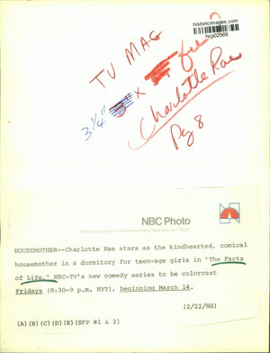 Housemother -- Charlotte Rae stars as the kindhearted, comical housemother in a dormitory for teen-age girls in "The Facts of Life", NCB-TV's new comedy series to be colorcast Fridays (8:30-9 p.m. NYT), beginning March 14. Charlotte Rae-The Facts of Life