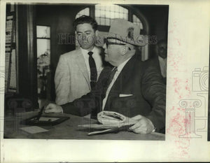 1957 Press Photo Two men speaking at a counter - hcp30454