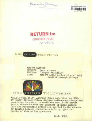 E™People Will TalkE™ - Dennis James moderates the NBC-TV Monday-through-Friday daytime audience-participation game show, in color, in which the man-in-the-street gets a chance to test his judgment of human nature. Cash and merchandise prizes are awarded to the winners of debates between contestants holding opposite points of view on key questions.
