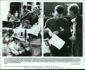 Top left: "Turner & Hooch" is directed by Roger Spottiswoode (right, in jacket) who previously directed the Touchstone thriller "Shoot to Kill". Below left Spottiswoode has a chat with his canine star, Beasley, who plays Hooch Right Tom Hanks (left), who portrays detective Scott Turner, discusses a scene with Spottiswoode (right) Mare Winningham also stars. A Touchstone Pictures presentation in association with Silver Screen Partners IV. Turner & Hooch" is directed by Roger Spottiswoode and produced by Raymond Wagner. Based on a story by Dennis Shryack & Michael Blodgett and Daniel Petrie, Jr. the screenplay is by Dennis Shryack & Michael Blodgett and Daniel Petrie, Jr. and Jim Cash & Jack Epps, Jr. The executive producer is Daniel Petrie, Jr. Buena Vista distributes.