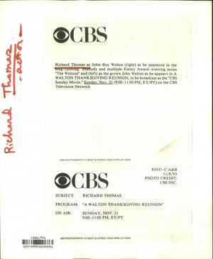 Richard Thomas as John-Boy Walton (right) as he appeared in the long-running Peabody and multiple-Emmy Award-winning series "The Waltons" and left as the grown John Walton as he appears in A Walton Thanksgiving Reunion, to be broadcast as the "CBS Sunday Movie," Sunday, November 21 (9:00-11:00 pm, ET/PT) on the CBS Television Network.