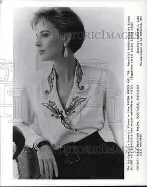 The intrigue of a dramatic blouse E” from Regina Porter Fall '88. Beautiful double-breasted blouse in 100% silk broadcloth has sutash embroidery on collar. (Suggested retail price: blouse $120). Jewelry: Kenneth J. Lane. Photographed at La Metairie, NYC