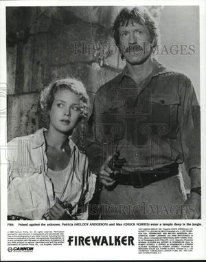 1986 Press Photo Melody Anderson & Chuck Norris in "Firewalker" Movie