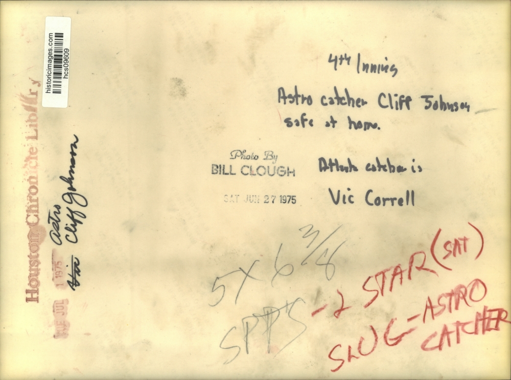 1975 Press Photo Astros catcher Cliff Johnson slides safely past Vic Correll.