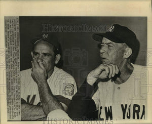 The two managers that startled the sports world after the World's Series met before yesterday's New York Yankees-Mets game. Yogi Berra, left, lost out as the Yankees manager and John Keane quit the Saint Louis Cardinals to take Berra's position as the new Yankees manager. They're pondering reporters' questions in this photo. St. Petersburg, Florida