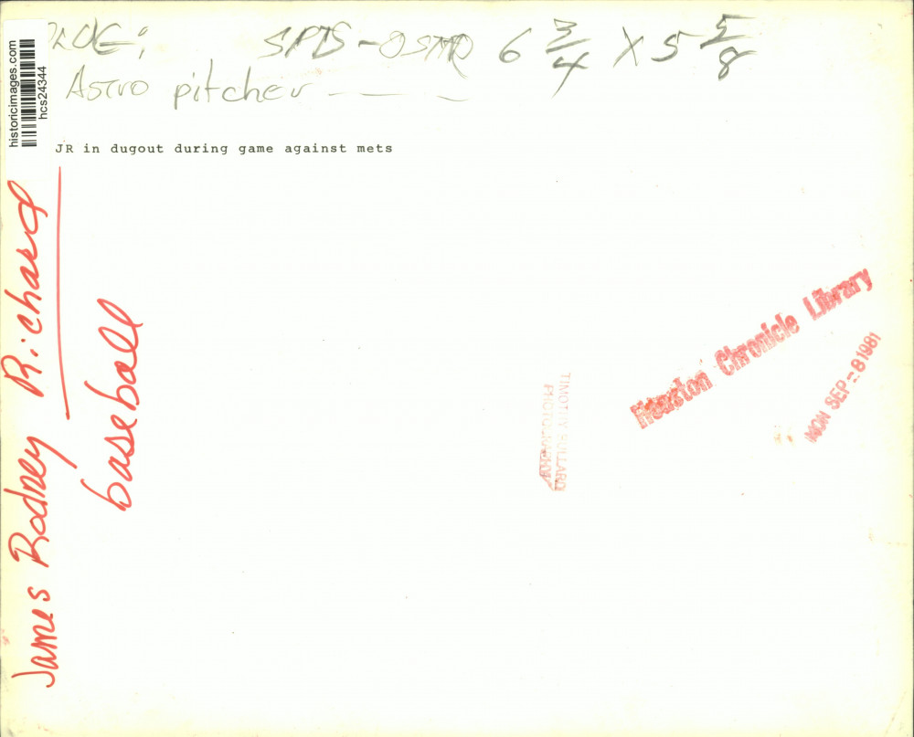 Houston Astros baseball pitcher James Rodney Richard sits on bench in dugout