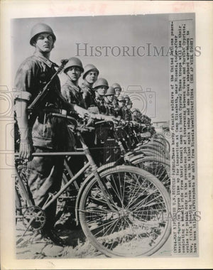 These hardy Finnish soldiers of the United Nations peacekeeping force on Cyprus line up for inspection at Camp Elisabeth, near Nicosia, today, after completing a 40-mile ride from their transit camp in South Cyprus. These troops will use their cycles for patrol duty in the precarious job of intervening between Greek and Turkish Cypriots. New, fitful shooting broke out on the island again today and one Greek shepherd was known to be have been killed.