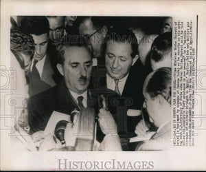 1955 Press Photo Primes Minister Moshe Sharett surrounded by newsmen in Israel.
