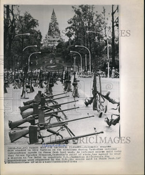 Cambodia, Parade Rest for Cambodian Firearms--Automatic weapons were stacked in this fashion on the sidelines during Cambodian National Independence Parade in Phnom Penh last week. An informed source said today that Prince Norodom Sihanouk, Cambodia's chief of state, has agreed to send a mission to the New Delhi to negotiate United States-Cambodia differences. The negotiations were requested by the United States, the source in Phnom Penh.
