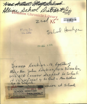 Aldine School District, School Howitzer, Dianna Hawkins, 16, daughter of Mr. and Mrs. John Hawkins of 2430 Balmorhea is a junior at MacArthur High School, 4400 Aldine Mail Road, shows off an old Army Cannon donated to the Aldine District School and displayed on campus.