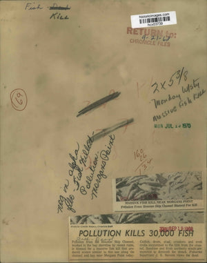 Pollution from the Houston ship channel, washed to the bay shoreline by recent rains, is blamed for a massive fish kill the produce seems similar to this one along the channel and Bay near Morgans Point today. Catfish, drum, shad, croakers and even crabs succumbed to the filth from the channel. Sunshine and fresh northerly winds are expected to diminish the stench. Fisheries Supervisor J. R. Stevens Views the dead. Massive fish kill near Morgans Point Pollution from Houston ship channel blamed for kill