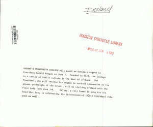 Galway's University College will Award in honorary degree to President Ronald Reagan on June 2. founded in 1845, the college is a center of Gaelic culture in the west of Ireland. The president, who will receive his degree in outdoor ceremonies on the grassy quadrangle of the school, will be visiting Ireland with the First Lady from June 1-4. Galway, a city famed in song for its beautiful bay, is celebrating its Quincentennial (500th Birthday) this year as well. Ireland