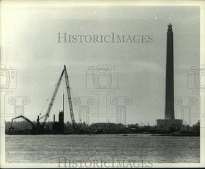 1973 Press Photo Tower and cranes work construction Land Subsidence, Houston, TX