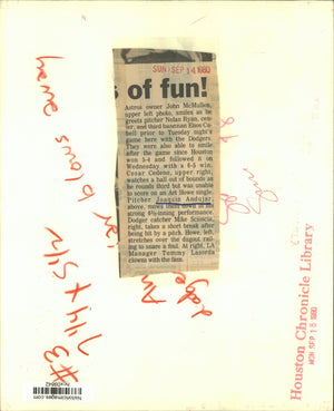 Baseball. Astros owner John McMullen, upper left photo, smiles as he greets pitcher Nolan Ryan, center, and third baseman Enos Campbell prior to Tuesday night's game here with the Dodgers. They were all able to smile after the game since Houston won 5-4 and followed it on Wednesday with a 6-5 win. Cesar Cedeno, upper right, watches a ball out of bounds as he rounds third but was unable to score on an Art Howe single. Pitcher Joaquin Andujar, above, mows them down in this strong 6 2/3-inning performance. Dodger catcher Mike Scioscia, right, takes a short break after being hit by a pitch. Howe, left, stretches over the dugout railing to snare a foul. At right, LA Manager Tommy Lasorda clowns with the fans.