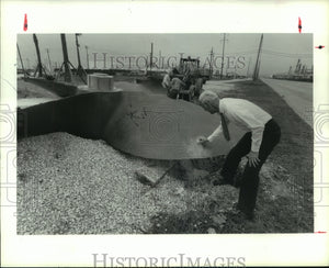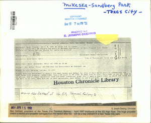 Mikeska-Sandberg Park, Texas City. Ken DeMaet, president of the Texas City Terminal Railway, cleans a section of a propeller salvaged from the harbor after the April 1947 explosion of the SS High Flyer. The huge propeller will be a key element in a new Texas City park.