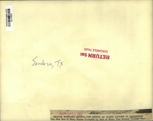 Sanderson, Texas - Search continues...volunteers dig into the ruins of a Sanderson home destroyed Friday in a devastating flood as the grim search for additional victims continued today. Lawmen have ordered every piece of wreckage examined for bodies, and every bush to be looked under. This was one of many homes crumpled by wall of water that rushed through town.