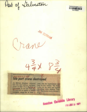Isle port crane destroyed...an 800-foot freighter rammed into this $1.3 million container crane on Pier 10 at the Port of Galveston, Texas. No one was hurt, but the port will be unable to handle container cargo for at least a year, and the replacement cost may be $2.5 million. The Stella Lykes hit the dock and toppled the crane while docking Tuesday. See related story, section 1, Page 1.