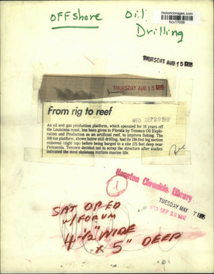From rig to reef...an oil and gas drilling production platform, which operated for 16 years off the Louisiana coast, has been given to Florida by Tenneco Oil Exploration and Production as an artificial reef, to improve fishing. The 300-ton platform, shown below still drilling, had its 130-foot leg section removed before being barged to a site 175 feet deep near Pensacola. Tenneco decided not to scrap the structure after studies indicated the steel skeletons nurture marine life.