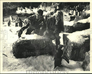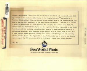 Five-time Emmy Award winner Dick Clark and supermodel Jerry hall pay a visit to the feathered inhabitants of the Penguin Encounter at Sea World of Florida. Clark and Hall (they're the one in the parkas) were at the Orlando marine life park to host the 1987 Supermodel of the world television special. The show will feature 25 beautiful models from all over the world who are vying for a three-year, $250,000 contract with the Ford Modeling Agency and the right to the title Supermodel of the World. Past winners of this exciting competition have gone on to superstardom in the world of professional modeling. Also appearing in the special will be recent Rock 'n; Roll Hall of Fame inductee Smokey Robinson, Grammy Award winner Laura Branigan and hit recording artists Atlantic Starr. The Supermodel of the World special may be seen in the Houston area on August 12,1987 on station KPRC at 12:30 pm. Sea Word - Florida.