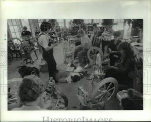 1989 Press Photo Fay Drozd helps spinning wheel students - hcx19669