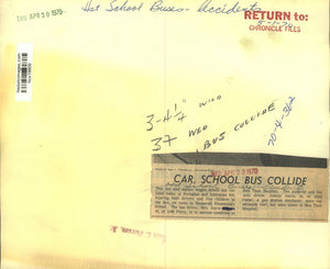 Houston school buses - accidents. This car and station wagon school bus collided today at Irvington and Interstate 610, injuring both drivers and five children in the bus, en route to Roosevelt Elementary School. The bus driver, Mrs. Joyce (unreadable), 44, of 5106 Perry, is in serious condition at Ben Taub Hospital. The students and the auto driver, Johnny Davis, 24, of 16523 Cedar, a gas station mechanic, were not seriously hurt, but were taken to Ben Taub hospital.