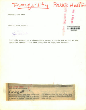 Two children take a quick dip in a fountain at downtown's Tranquility Park in an attempt to cool off in Houston's heat and humidity. The forecast calls for more of the same Thursday, with partly cloudy skies and a high in the mid-90s. Tranquility Park - Houston. Two kids engage in a pleasurable no-no, playing in the water at the towering Tranquility Park fountain in downtown Houston.