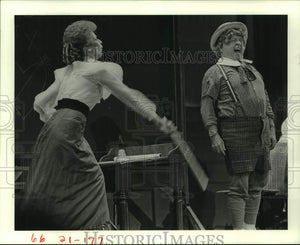 Mickey Rooney as the bad boy of the classroom almost gets a swatting from marm Carol Lawrence in a scene from the traveling Broadway burlesque musical, "Sugar Babies," at the Music Hall through May 15. Play.