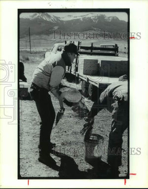 1993 Press Photo Biologists in Montana dye swan's wing so it can be tracked