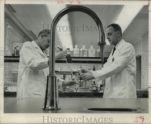 Dr. James B. Ragland, 2105 Swift, left, head of the biochemistry and pharmacology division, and research assistant Lawrence Godlman, 5008 Crawford, are transferring blood samples to test tubes for studies. The research involves determining to what parts of the body tranquilizers go after they're taken by a patient. Houston State Psychiatric Institute. Texas Research Institute of Mental Sciences.