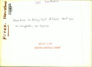 Firefighters on scene of Berry Court (at Ennis) house fire in Houston, Texas. About 1 p.m.. No occupants, no injuries. Fires.