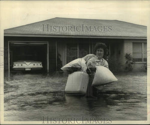 Mrs M.F. Parmer of 7225 Miley carries belongings from flood-threatened home. Water seeped into homes in the area causing damage to rugs and flooring. Floods-Houston