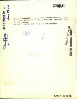 Harris County Sheriff W. L. Hunton inspects interior of crushed pickup truck. Mom and two kids were injured and taken to Eastway General. It happened on Highway 90 and C. E. King Boulevard in East Houston. Traffic Accidents - Houston, Texas.