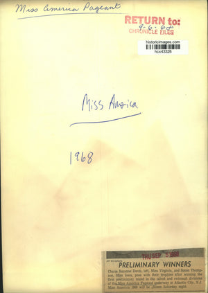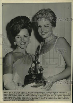 Atlantic City, New Jersey - Cherie Suzanne Davis, Miss Virginia, and Susan Thompson, Miss Iowa, winners of the first preliminary round of competition in talent and swim suit divisions respectively pose with their trophies after last night's performance in Atlantic City. Title of Miss America 1969 will be awarded at close of competition next Saturday night. ...underway in... finalists. Pageant.