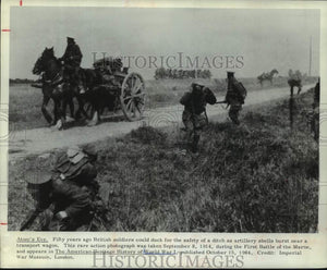 Fifty years ago British soldiers could duck for the safety of a ditch as artillery shells burst near a transport wagon. This rare action photograph was taken September 8, 1914, during the First Battle of the Marne, and appears in "The American Heritage History of World War I," published October 15, 1964. Written by Gen S.L. A. Marshall World War I