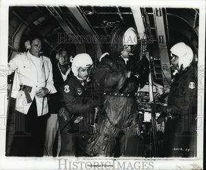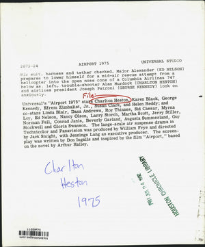 His suit, harness and tether checked, Major Alexander (Ed Nelson) prepares to lower himself for a mid-air rescue attempt from a helicopter into the open nose cone of a Columbia Airlines 747 below as, left, trouble-shooter Alan Murdock (Charlton Heston) and airlines president Joseph Patroni (George Kennedy) look on anxiously. Universal's "Airport 1975" stars Charlton Heston, Karen Black, George Kennedy, Efrem Zimbalist, Jr., Susan Clark, and Helen Reddy; and co-stars Linda Blair, Dana Andrews, Sid Caesar, Myrna Loy, Ed Nelson, Larry Storch, Martha Scott, Jerry Stiller, Conrad Janis, Beverly Garland, Guy Stockwell and Gloria Swanson. The large-scale air suspense drama in Technicolor and Panavision was produced by William Frye and directed by Jack Smight, with Jennings Lang as executive producer. The screenplay war written by Don Ingalls and inspired by the film "Airport," based on the novel by Arthur Hailey.
