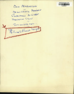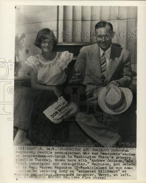 Don Magnuson, Seattle newspaperman who was Democrat's choice as congressman-at-large in Washington State's primary election Tuesday, shown in Seattle with "Andrew Jackson," his "No. 1 campaigner and vote-getter." Magnuson, not related to Senator Warren Magnuson (D-WA) claimed he won nomination by parading Andy as "animated billboard" at public gatherings. Newsman's daughter, Terry, at left.